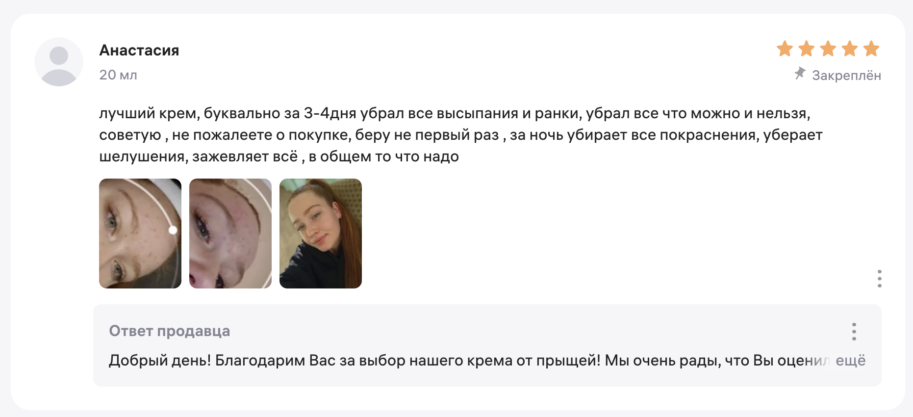 Закрепите отличный отзыв с фотографиями: например, где видно эффект от товара или посадку на стандартной фигуре.