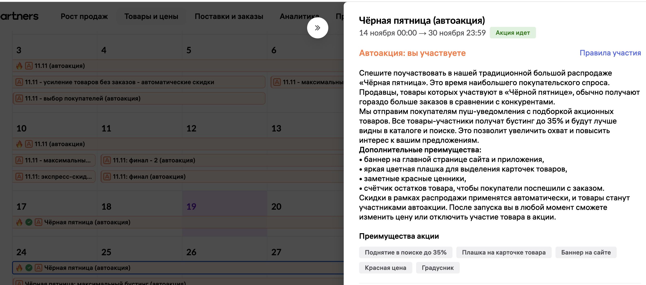 3. Участие в акциях и распродажах. Присоединяйтесь к тем, что организует площадка — бывают обычные акции и автоматические. В первом случае вам нужно самостоятельно добавить товары из подборки, а во втором случае площадка сделает все за вас. Платить за участие не нужно, но нужно заранее учесть возможные распродажи при расчете цен или выставить минимальную цену и запрет на автоакции для конкретных товаров.