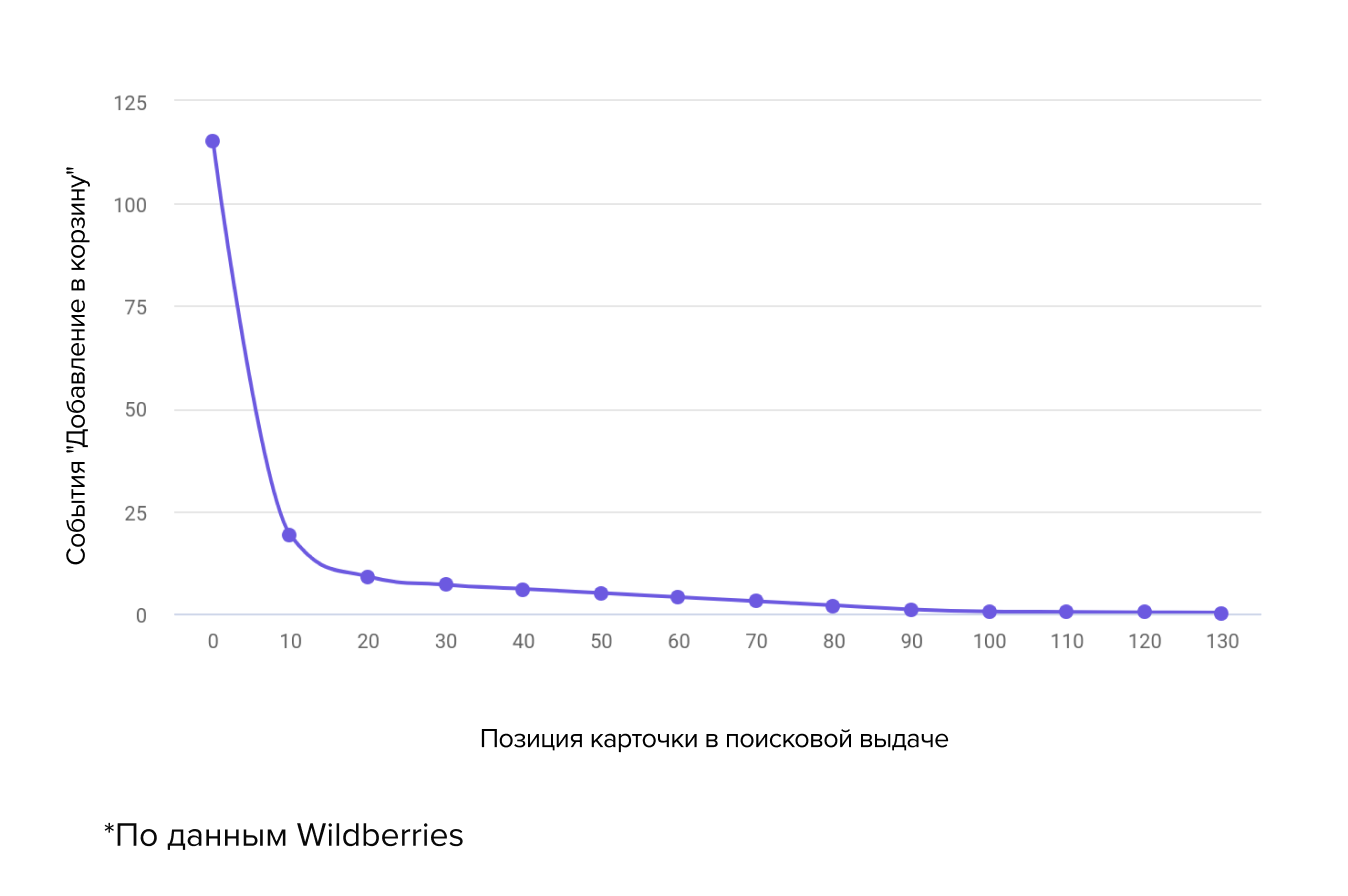 Чем выше ваша позиция в поиске, тем больше шансов попасть в корзину — причем основная борьба, по данным WB, идет за первые 10 позиций.