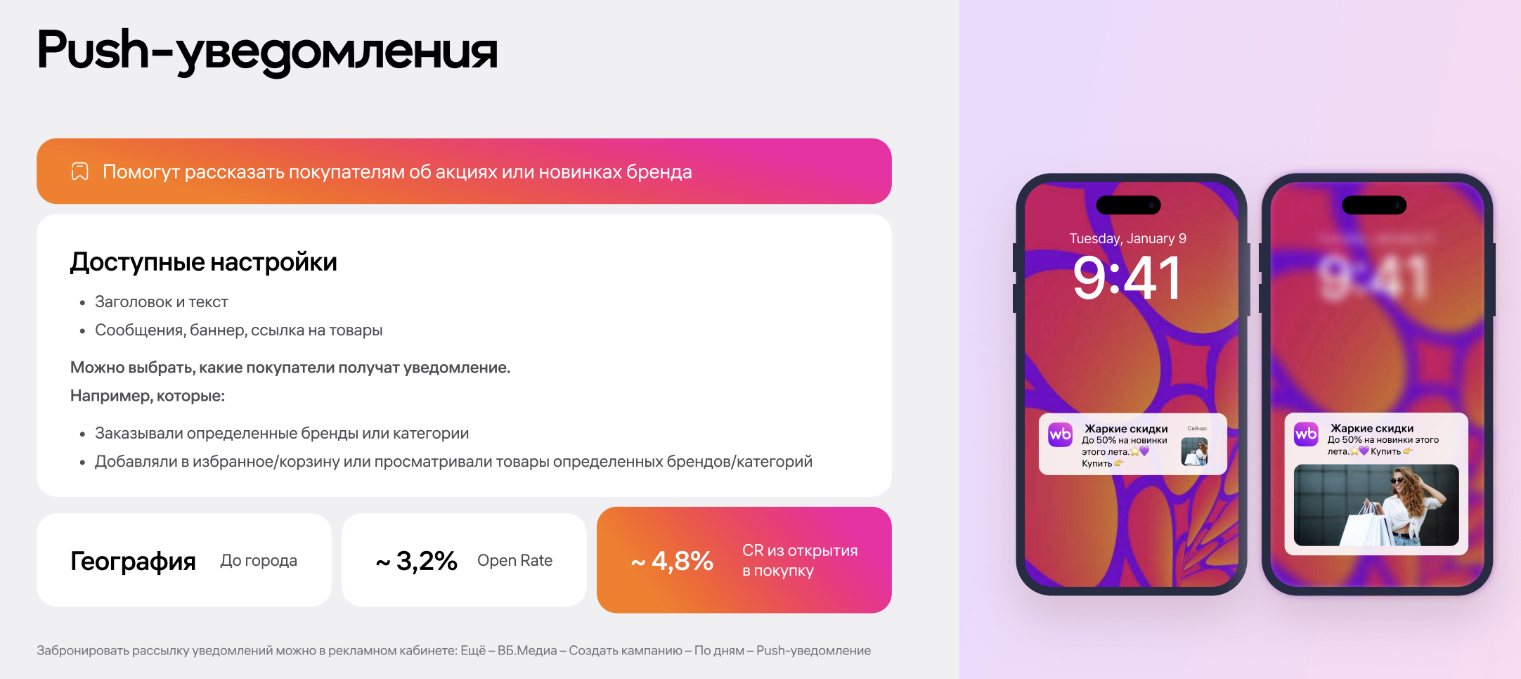 Клиенты получают уведомления о снижении цены на товары, которые поместили в любую из подборок; о поступлении нужного варианта. Также вы можете самостоятельно настроить рекламную кампанию WB Медиа с пуш-уведомлениями среди тех, кто поставил лайк вещи или положил в корзину продукцию определенных брендов или категорий.