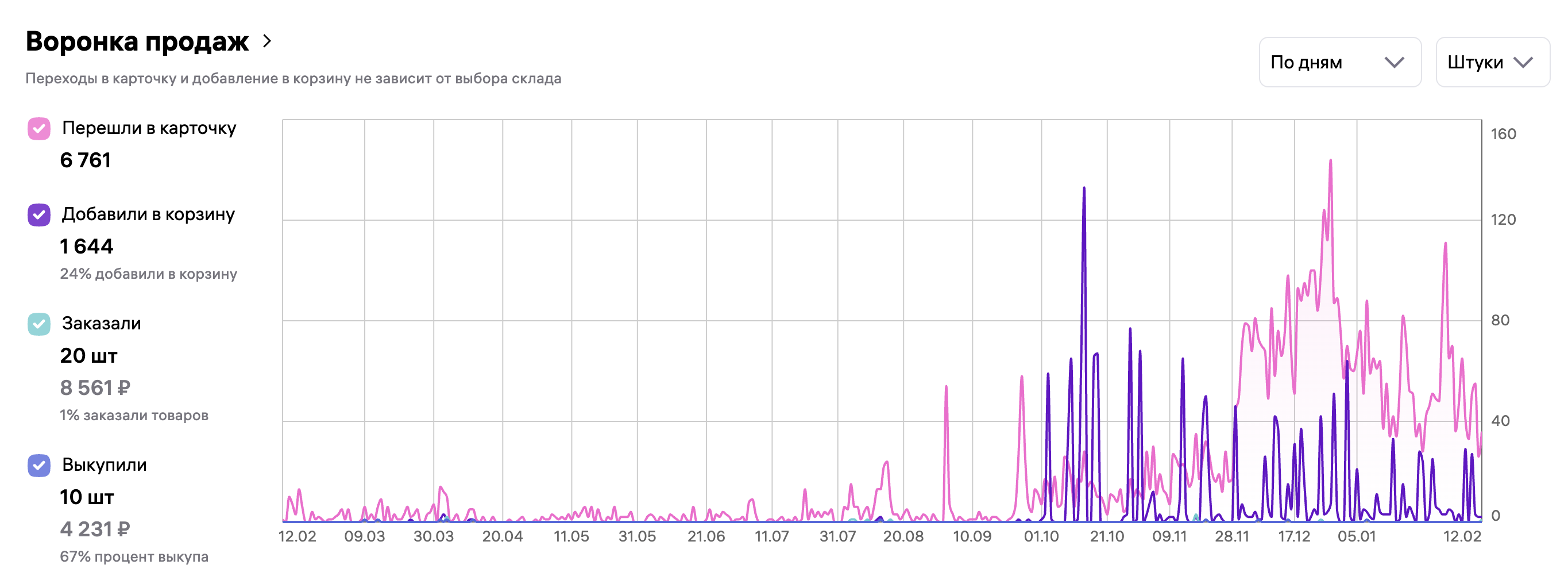 В первую очередь смотрите на то, что показывает базовая воронка продаж — переходы в карточку, добавления в корзину, заказы, выкупы.