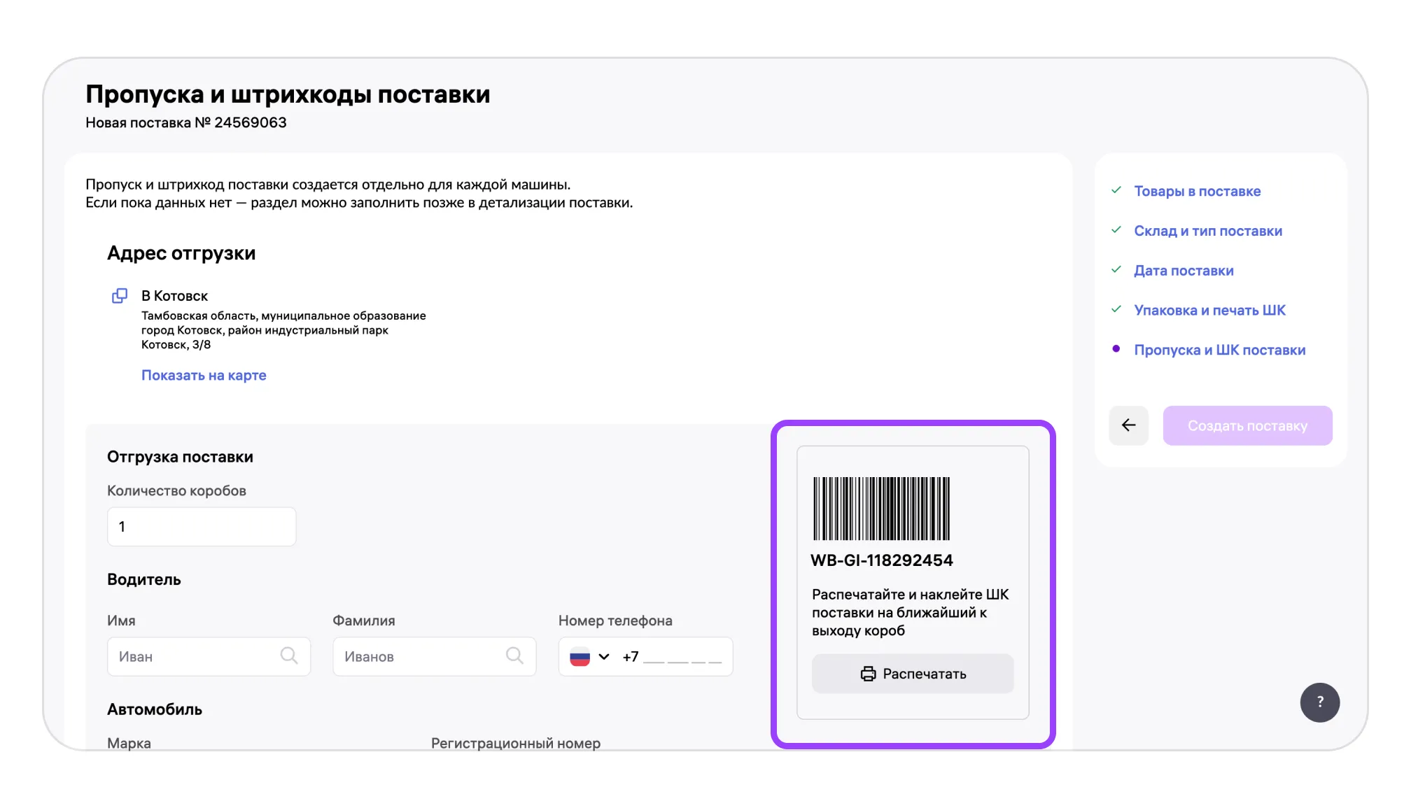 1. В личном кабинете создать поставку