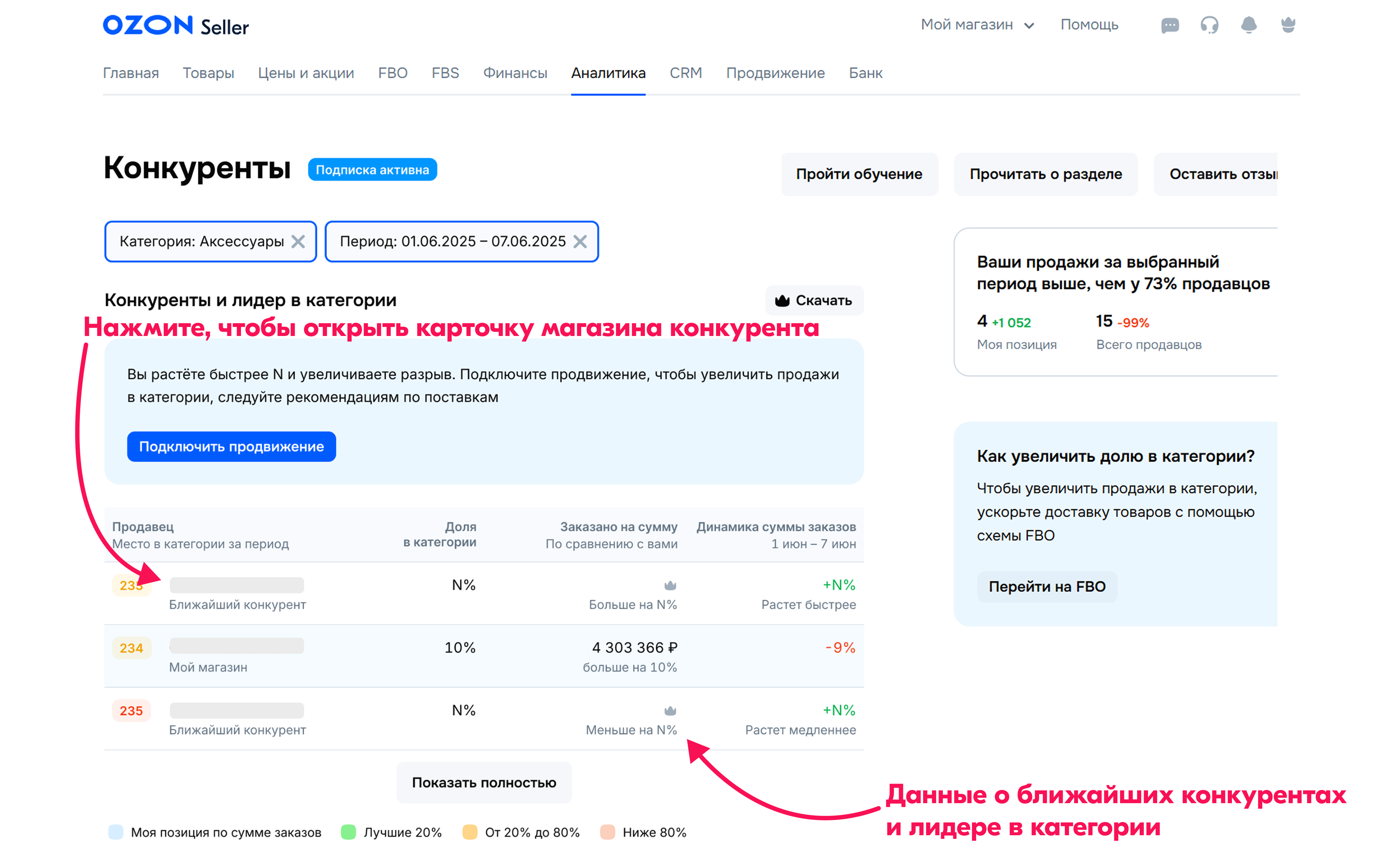 Анализ конкурентов на Озон поможет сделать отдельный инструмент. Он доступен по подписке в разделе «Аналитика». Селлер увидит, какое место занимает среди продавцов в своей категории, востребованы ли его товары.