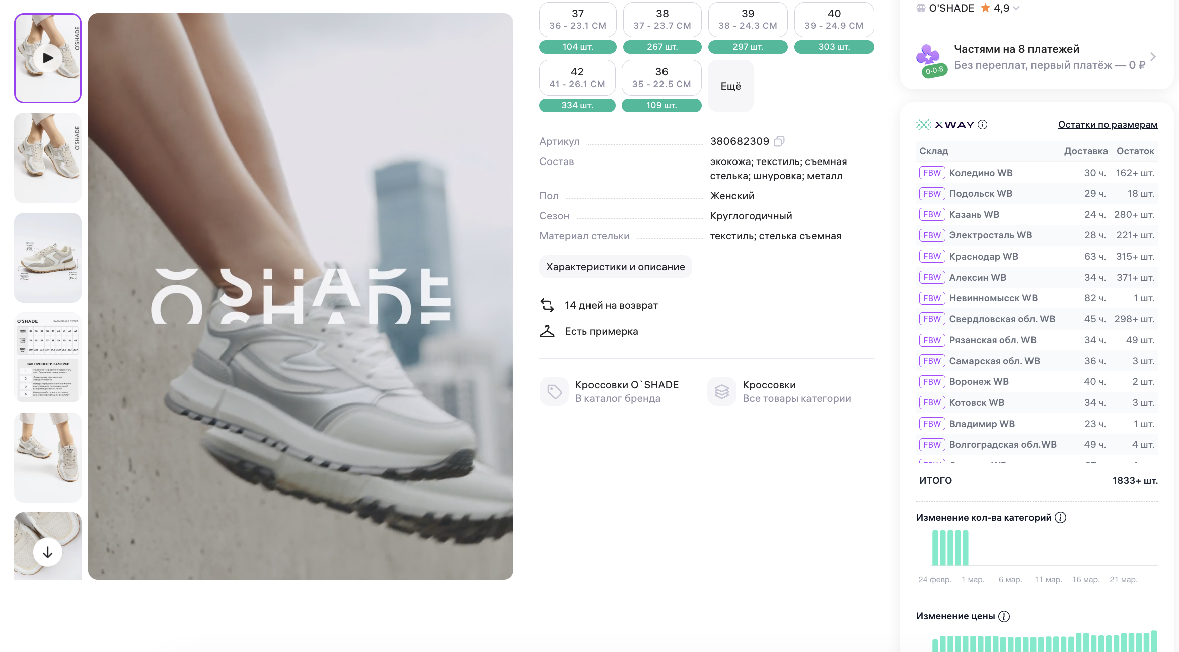 Оцените, в каких регионах представлены селлеры — это напрямую влияет на позиции в выдаче и скорость доставки. Также количество остатков может показать ходовые модели и размеры, а также те, что совсем не пользуются спросом — но важно учитывать, что селлеры тоже совершают ошибки, и кто-то может отгрузить на склад большую партию при незначительных заказах. Поэтому важно смотреть показатели в динамике.