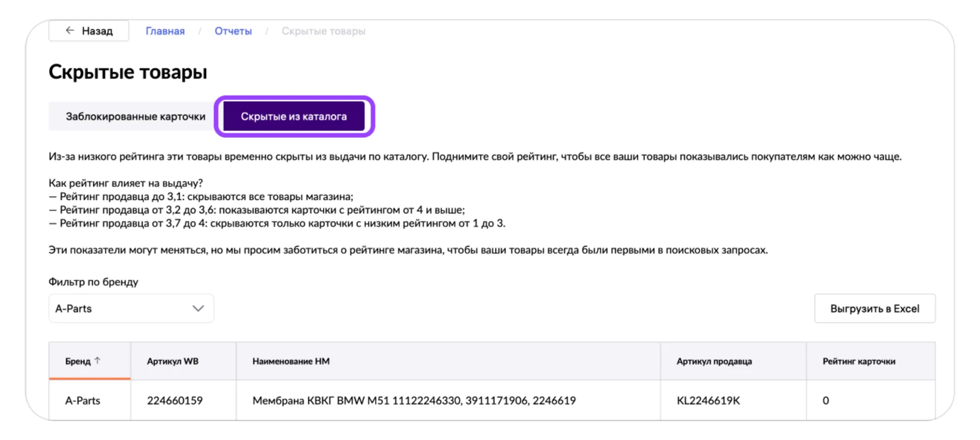Можно посмотреть товары, которые вообще скрыты из каталога — поэтому не получают просмотров и заказов. Чтобы это исправить, нужно поднять рейтинг магазина.