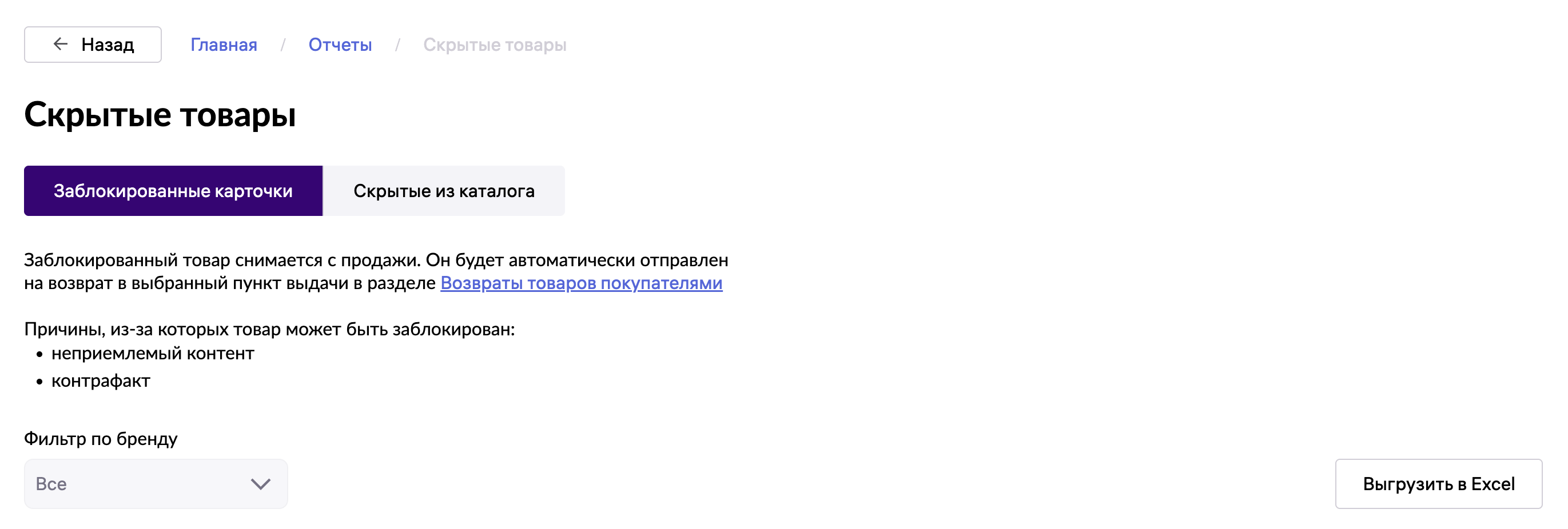 Посмотреть заблокированные товары можно в разделе «Отчеты».