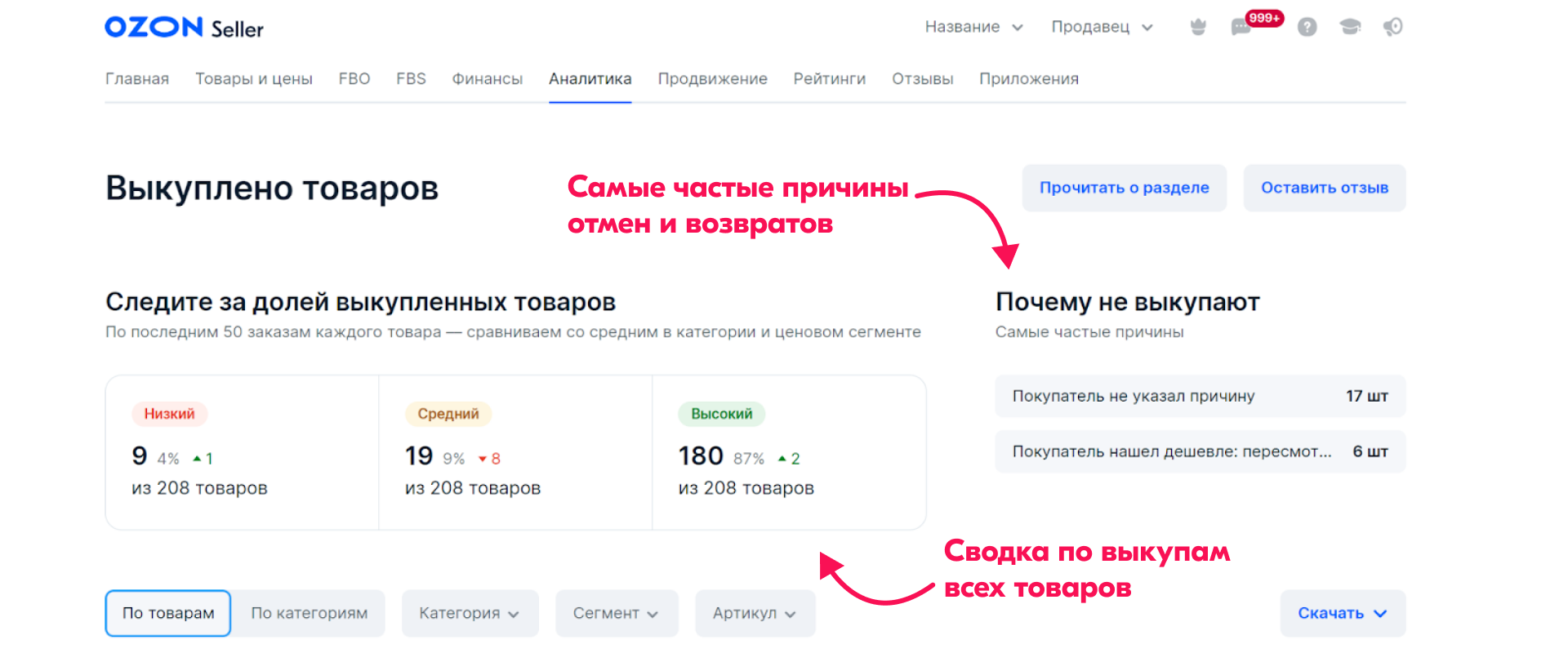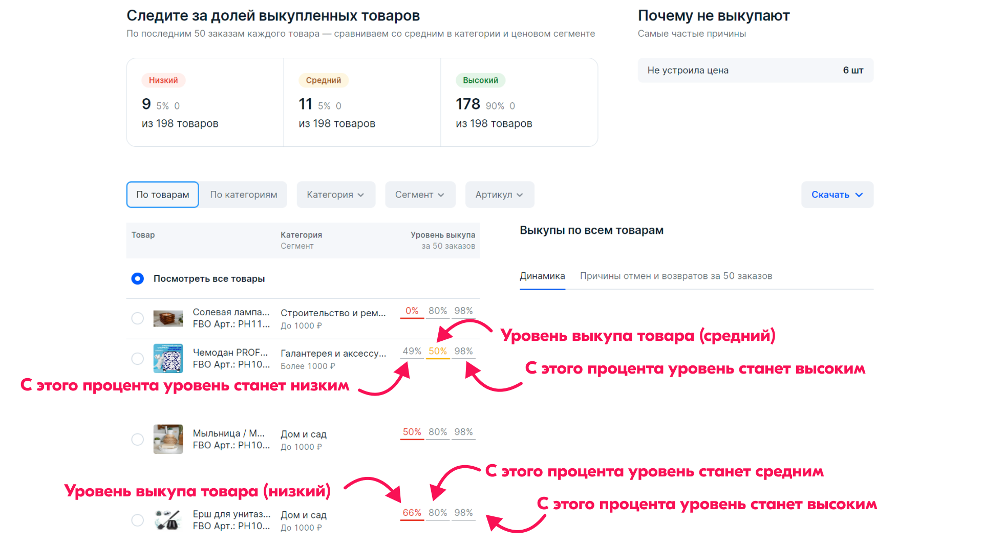Процент выкупа — важный индикатор для бизнеса, который может сигнализировать о проблемах на любом из этапов. Слишком хвалебная карточка, низкое качество, необязательный партнер по доставке — найти изъян поможет блок с частыми причинами отказов.