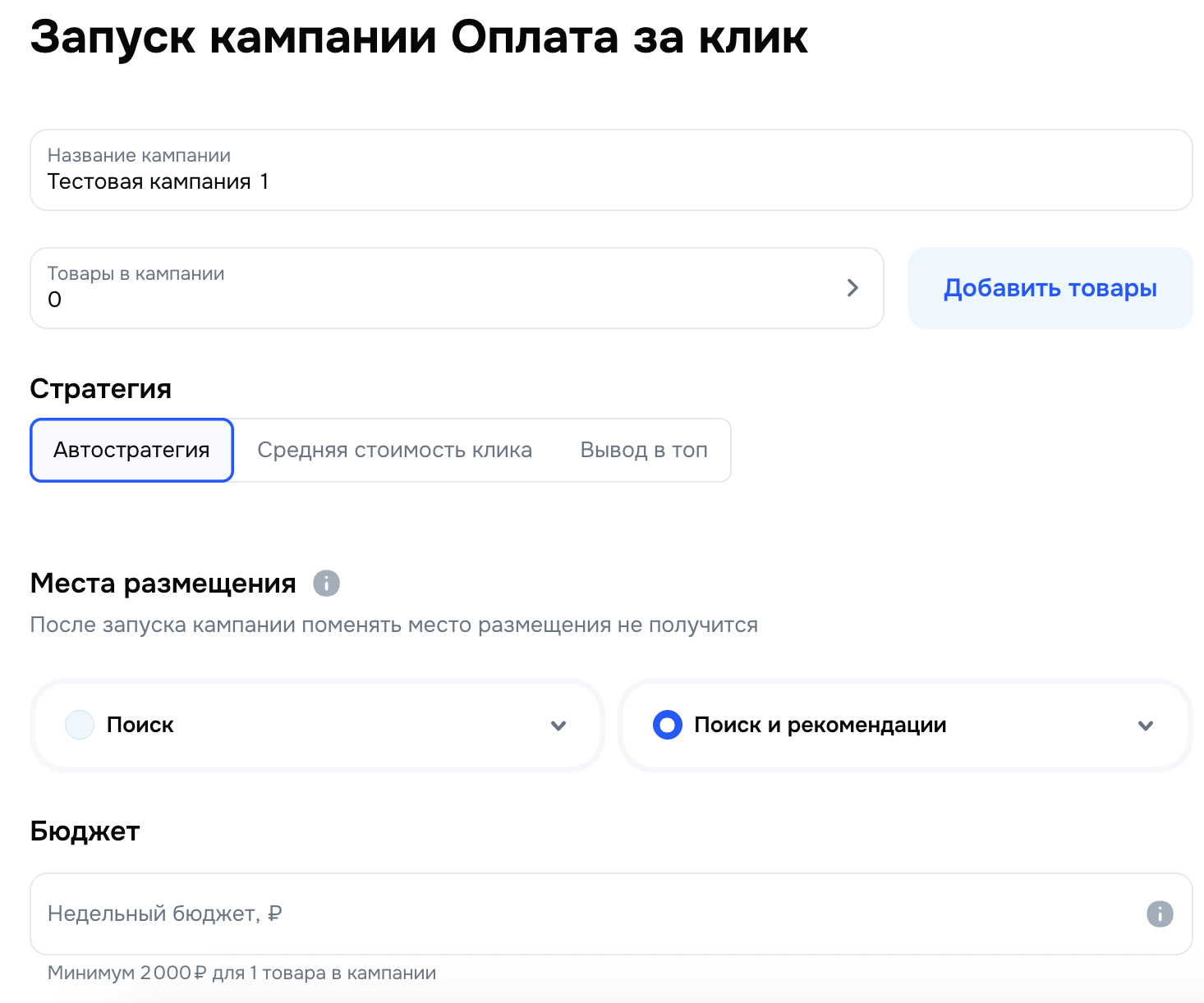 Чтобы получить первые заказы для нового товара, подключите максимально охватные «Поиск и рекомендации» и поставьте среднюю стоимость клика, опираясь на средний показатель рынка.