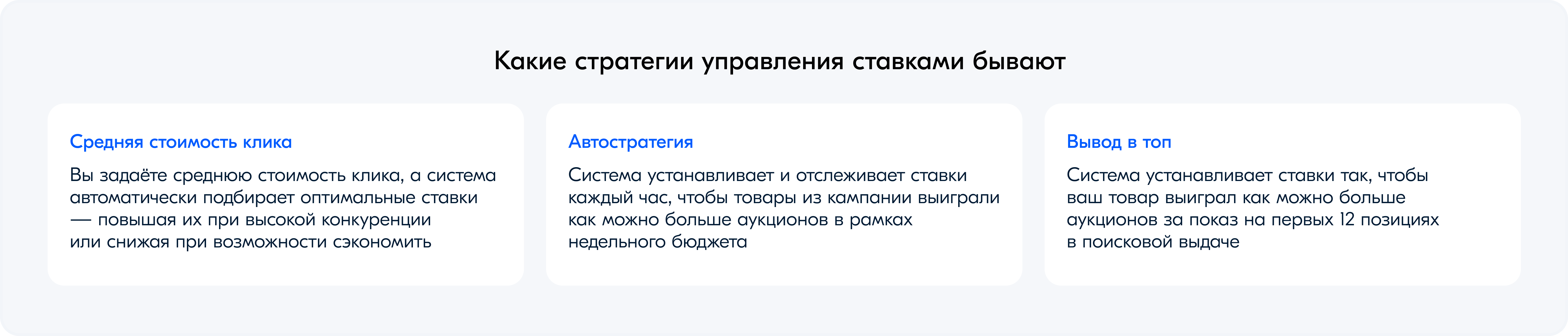 Самый важный аспект — ставка. Позиции распределяются между селлерами по принципу аукциона — чем больше ставка, тем выше шансы на топовое место. Селлер может целиком доверить управление системе (автостратегия), задать среднюю цену, которую готов тратить на один переход, или обозначить, что может платить сколько угодно, ради попадания на вершину выдачи (вывод в топ).