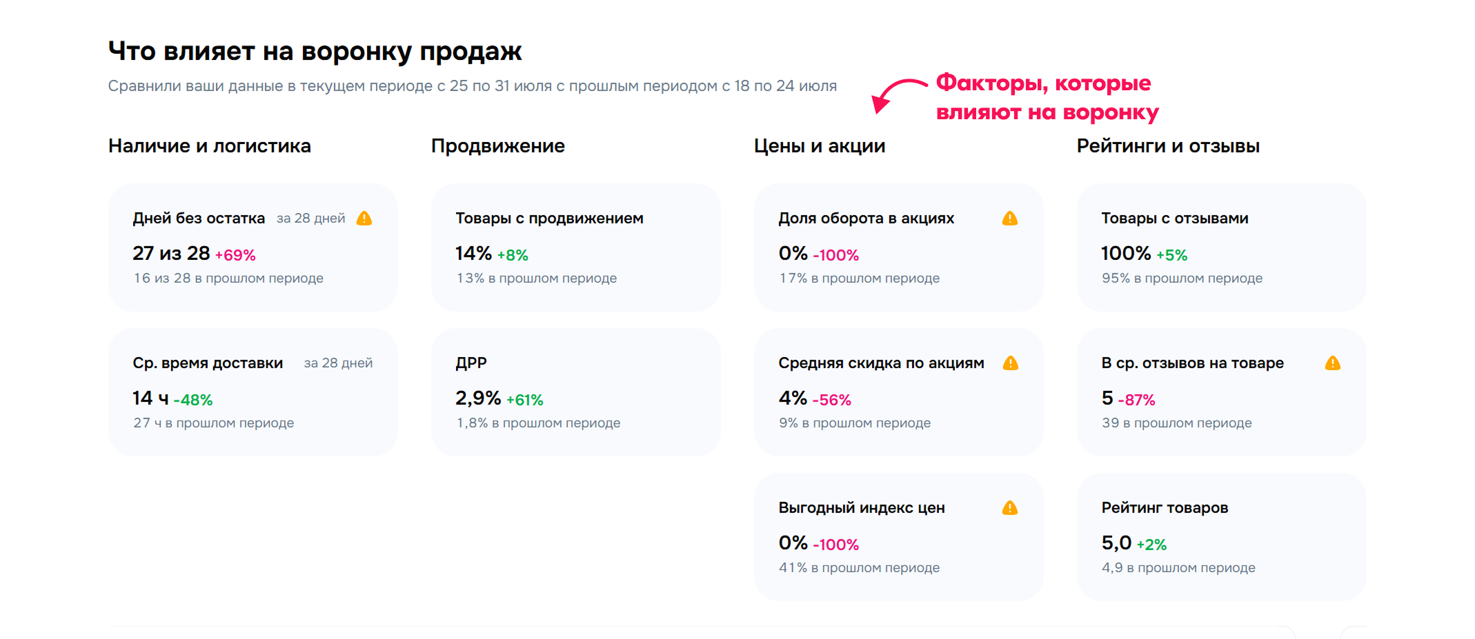 Также провести анализ товаров нужно, если замечаете просадку по показателям, планируете поучаствовать в распродаже или увидели увеличение негативных оценок.
