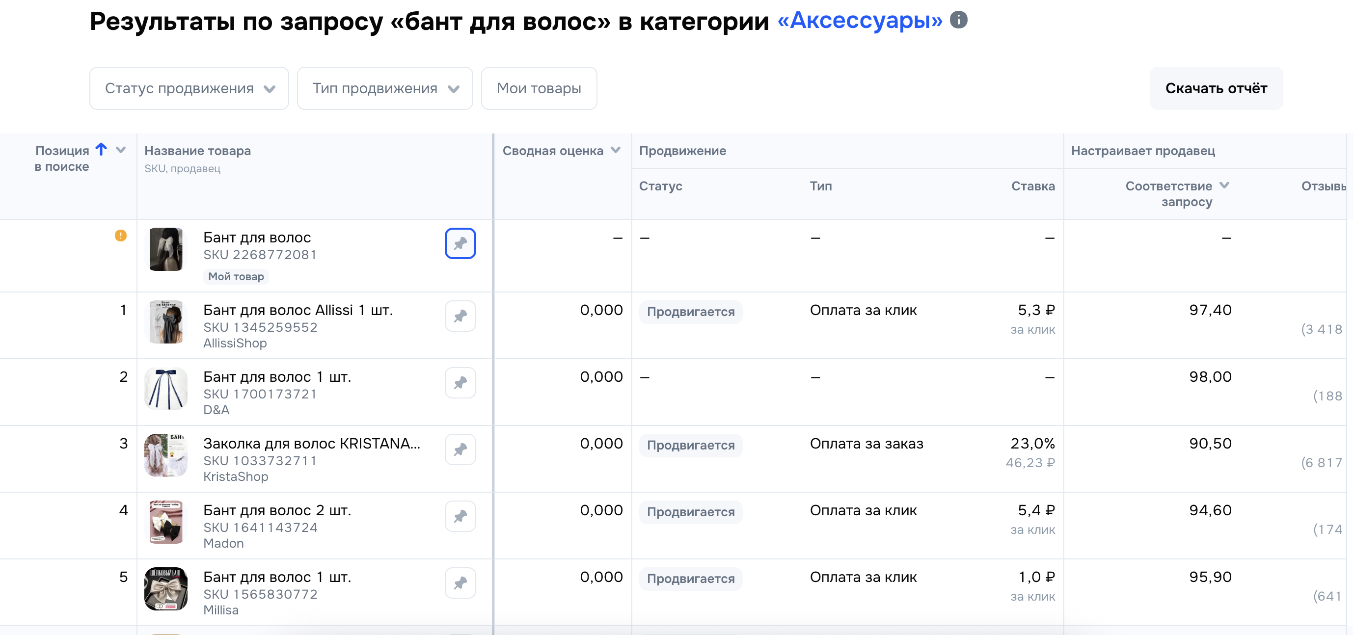 На место в поиске влияют разные факторы, больше о них мы писали в статье о SEO-оптимизации на Ozon. Также можно сравнить свои показатели с данными конкурентов: например, цену, сроки доставки, участие в акциях.