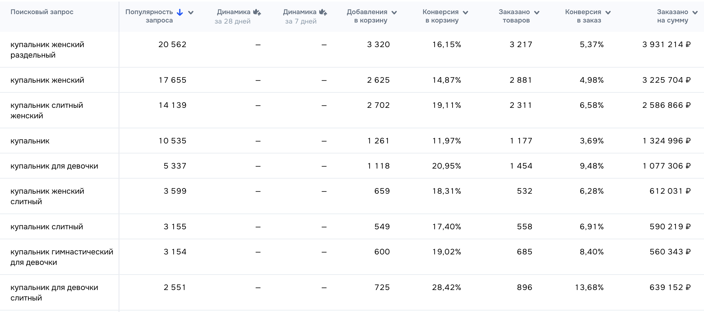Инструмент подойдет и при формировании ассортимента. Например, запрос «купальник женский раздельный» популярнее запроса «купальник слитный женский».