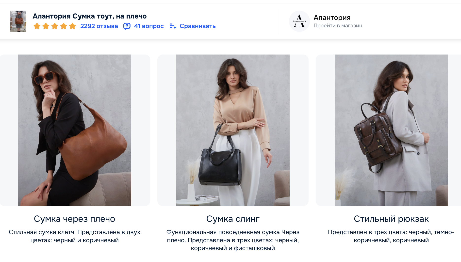 Рич-контент поможет рассказать не только о самом предмете, но и о бренде, а еще даст добавить ссылки на сопутствующую продукцию или другие популярные модели.