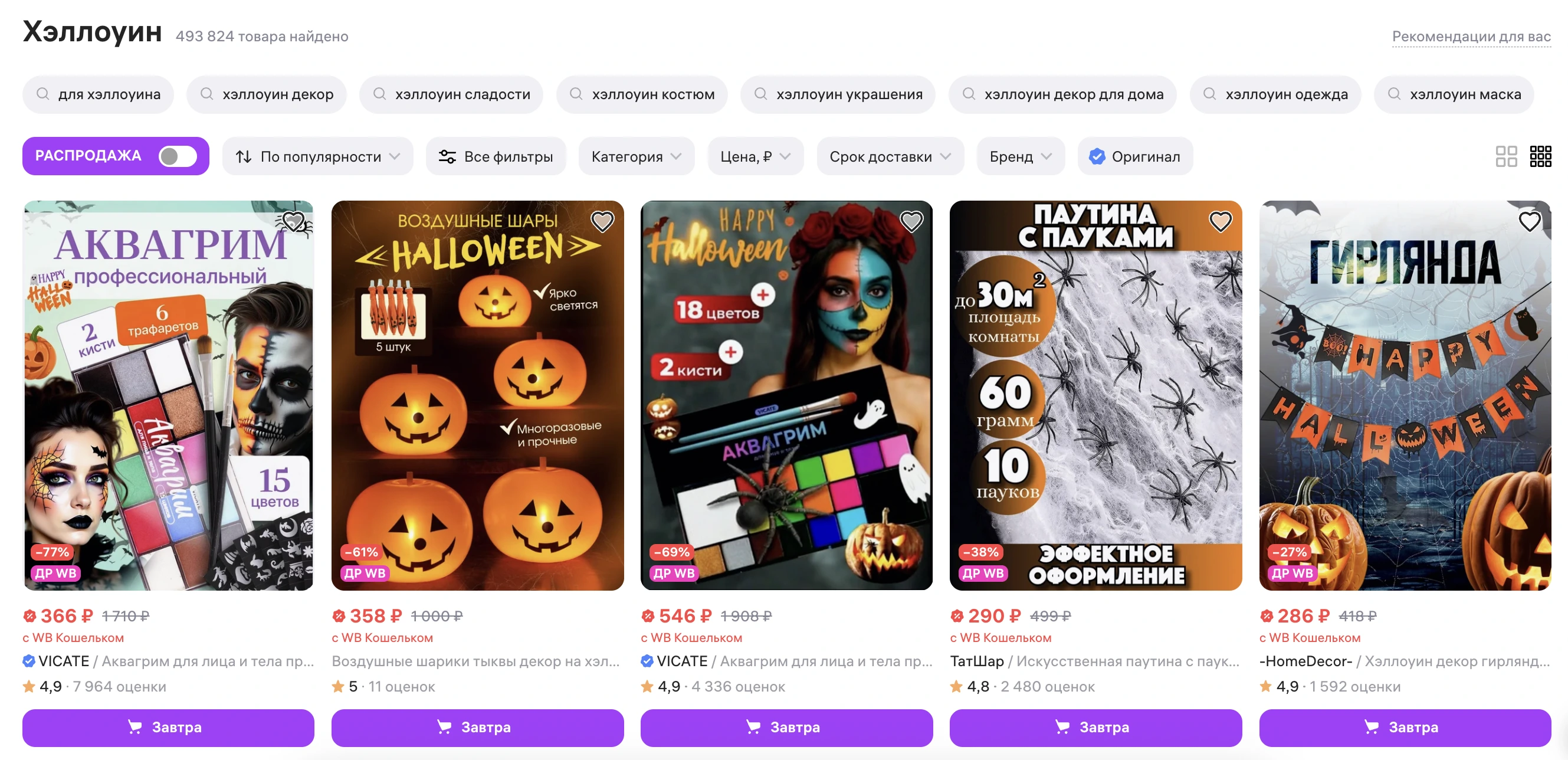 Профессиональный аквагрим — товар, который не привязан к конкретному празднику. Но благодаря сезонной работе с карточкой, он высоко поднимается в выдаче по запросу «Хэллоуин».
