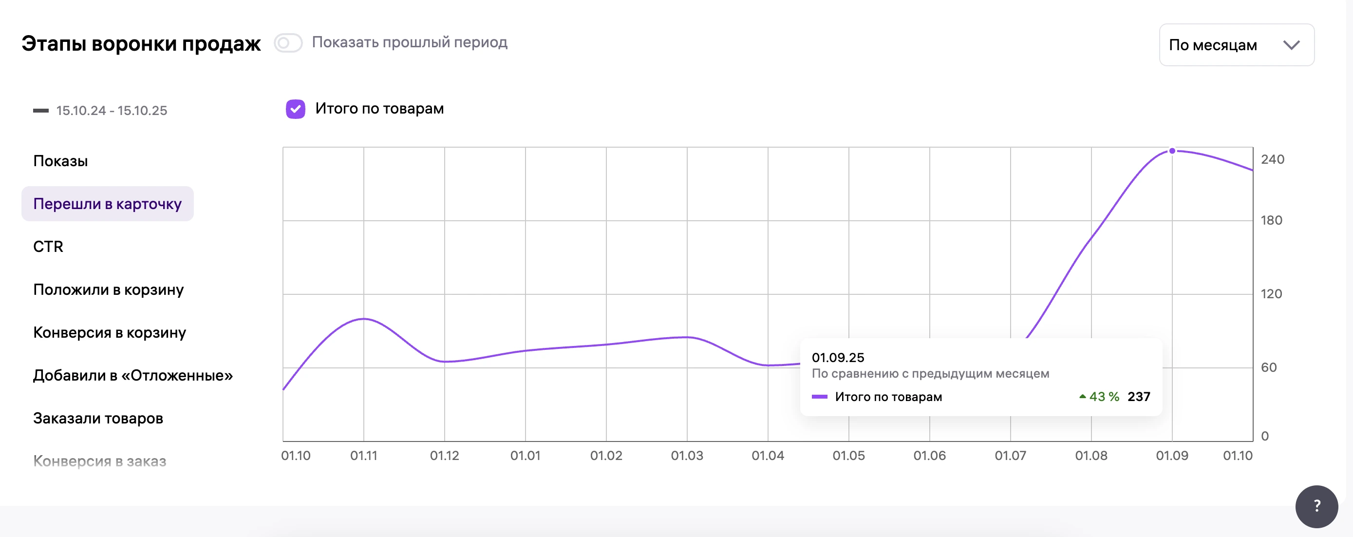 Для сбора данных подойдут внутренние инструменты WB — например, отчет «Воронка продаж».
