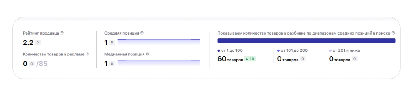 Прикинуть средние позиции в выдаче поможет отчет «Поисковые запросы: ваши товары» — в нем отражены средняя и медианная позиции карточки.