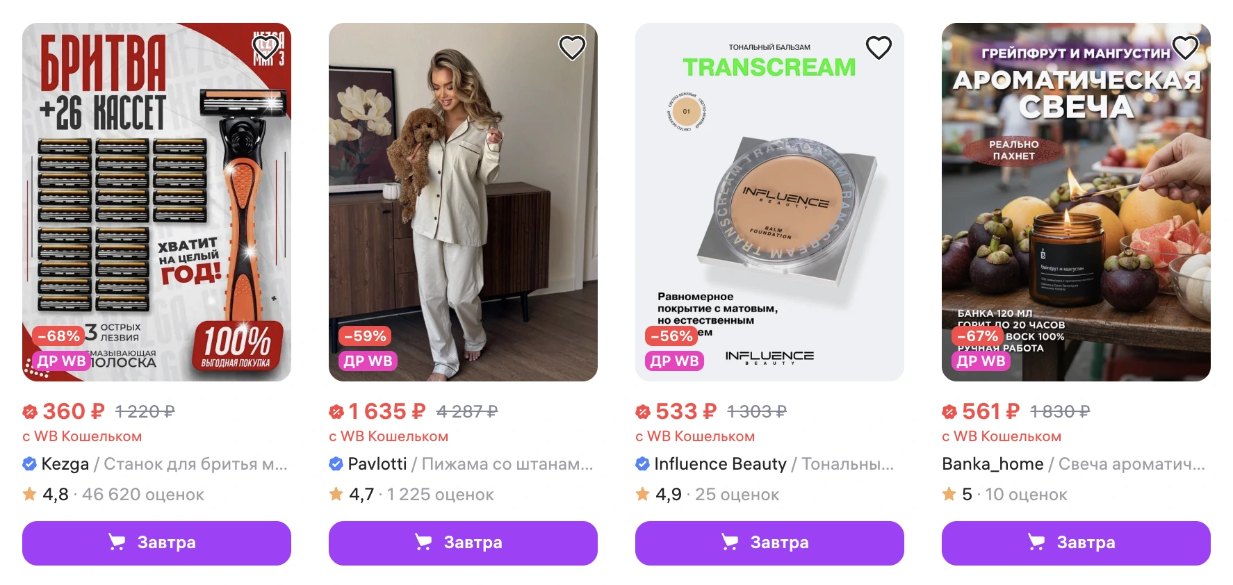Пример из ленты: плашки со скидками и «ДР WB» не дают прочитать информацию у тонального бальзама и свечи. Селлер бритвы отодвинул текст, но пересечение все равно осталось.