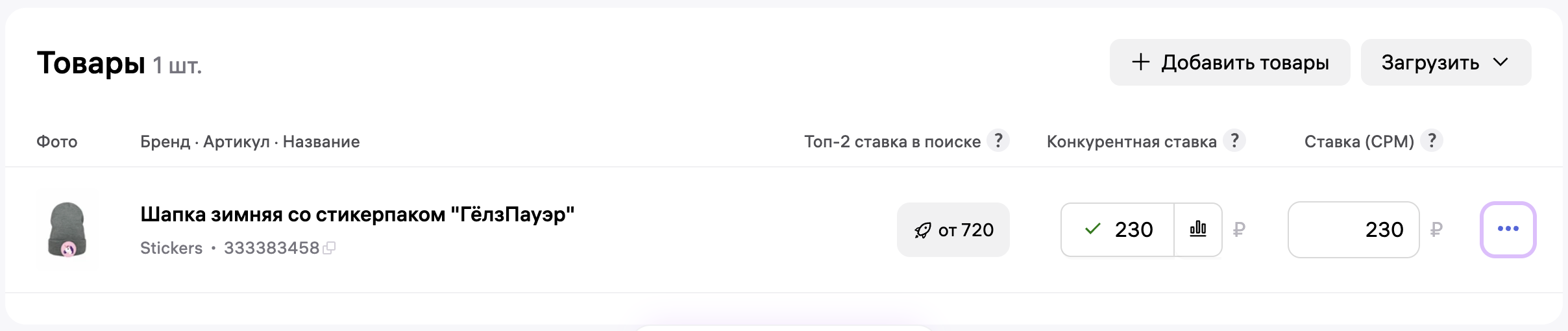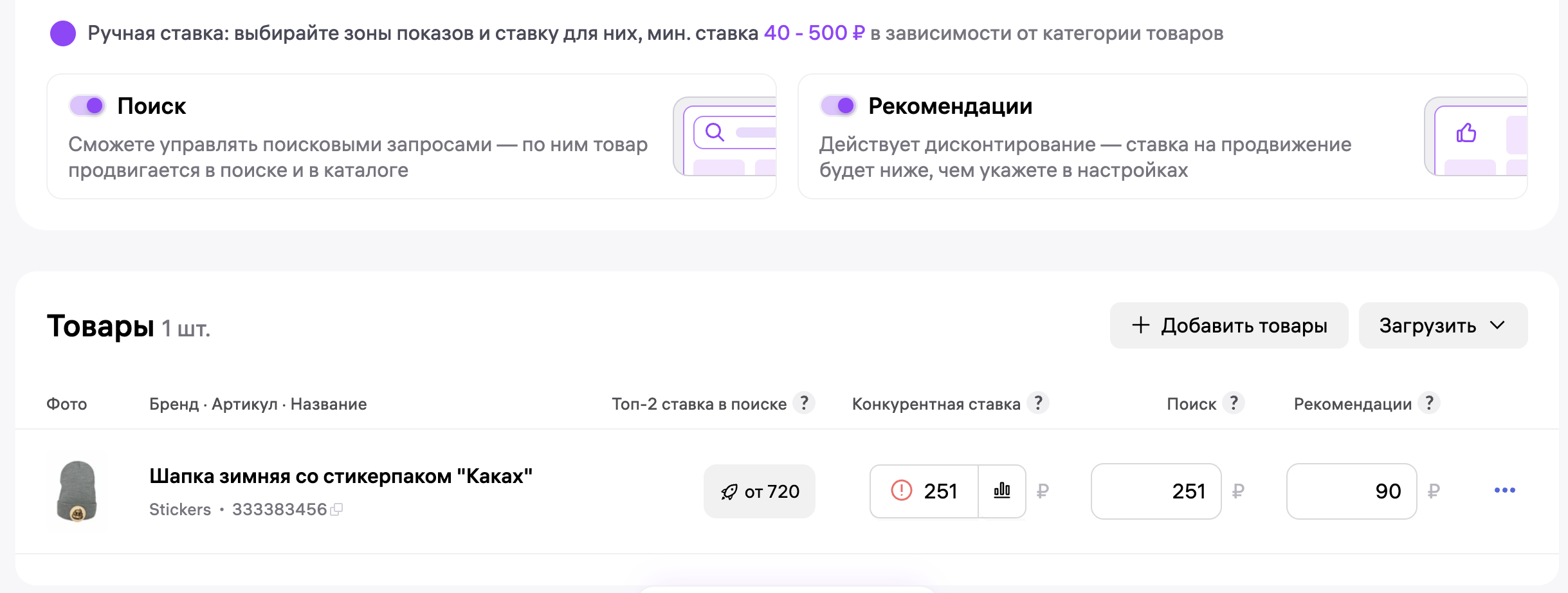 Кроме того, в обеих типах можно выставить значение, чтобы побороться за топ-1 или топ-2 места в выдаче. Инструмент пока работает не для всех категорий, но им стоит пользоваться, если есть средства — по данным маркетплейса, конверсия в клик на этих позициях более чем в два раза выше, чем у карточек с низкой позицией.