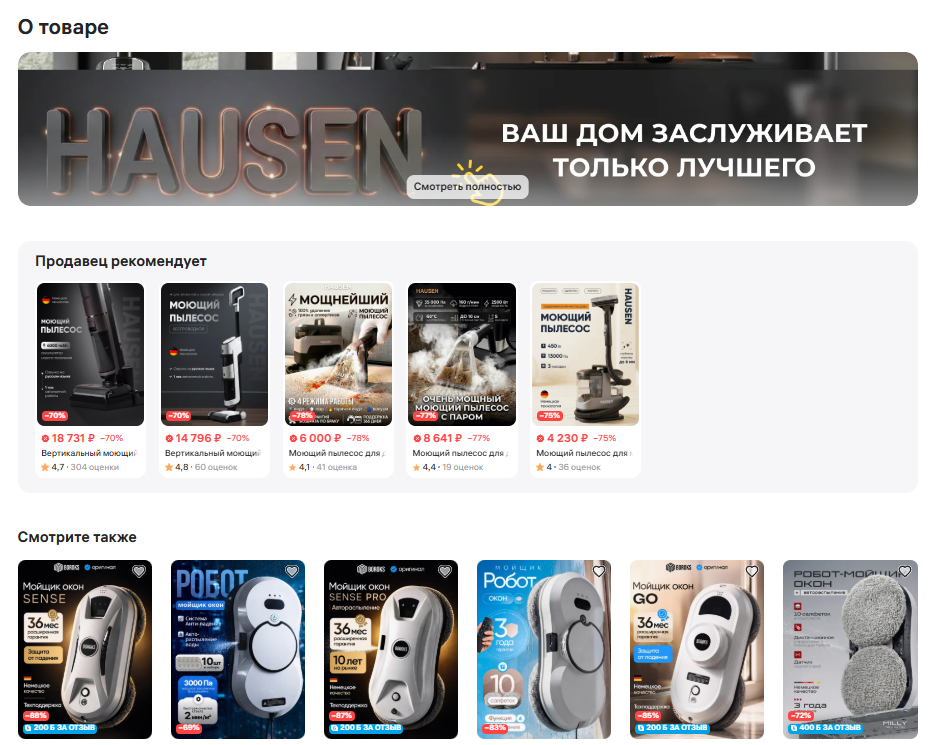 Рекомендации продавца ВБ — это отдельный блок, который отображается в карточке, если его подключить платно. Он появится перед разделом «Смотрите также», который собирается алгоритмами маркетплейса автоматически — туда может попадать аналогичная продукция конкурентов или вещи, которые часто покупают вместе.