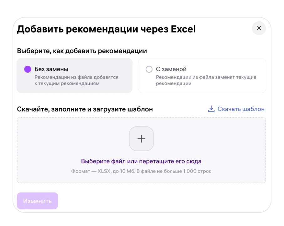 Другой способ — загрузить обновленный excel-файл. Нажмите на стрелочку, чтобы выбрать действие: добавление (по умолчанию), замена или удаление. Шаблоны отличаются друг от друга.