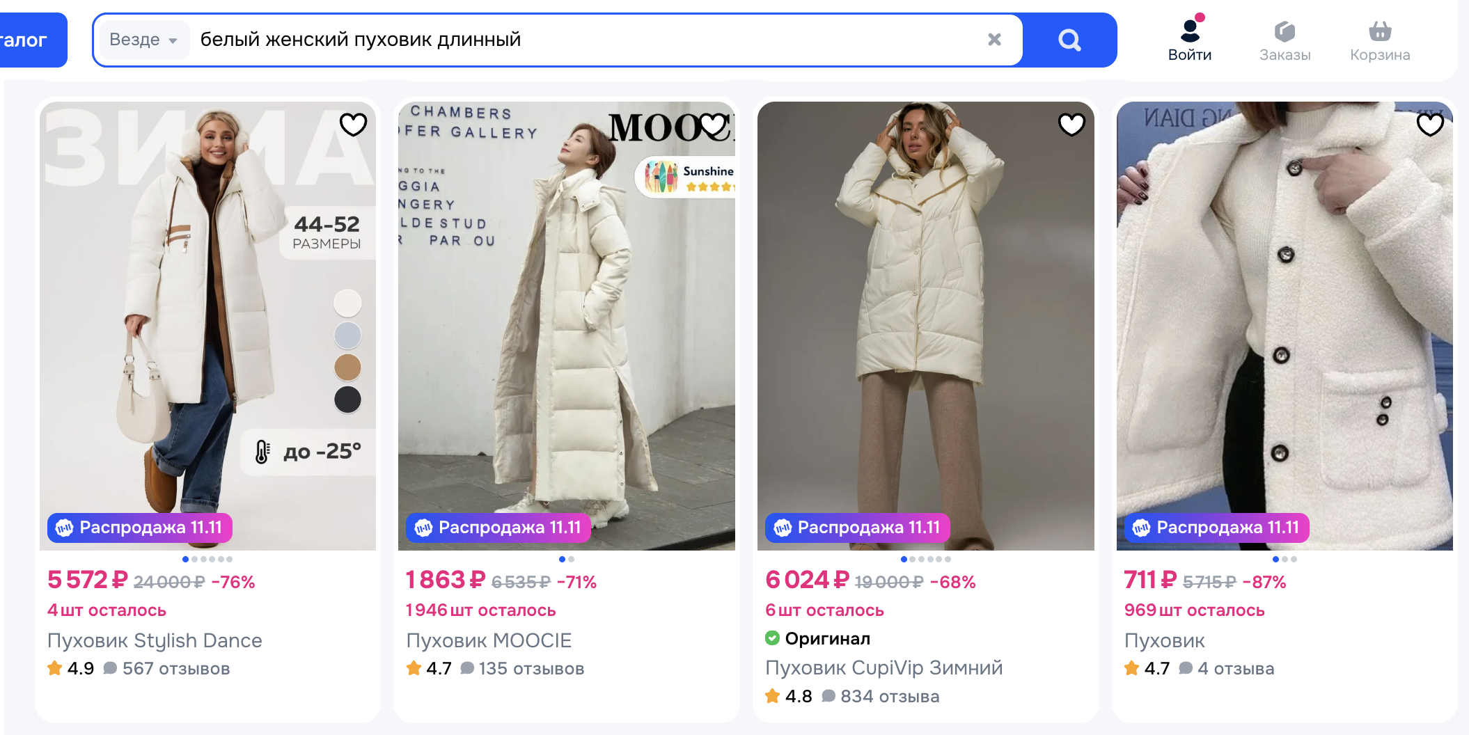 Детали работы с визуалом будут зависеть от категории, целевой аудитории и назначения товара — например, для вечерних платьев инфографику, как правило, не делают, а у пуховиков она почти всегда есть. Если сложно определиться, посмотрите, что делают конкуренты.