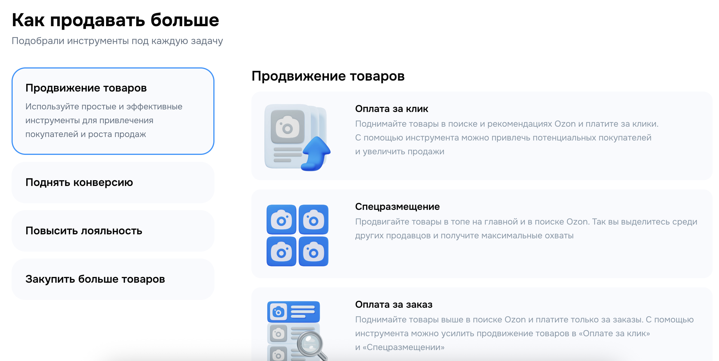 Внутри личного кабинета маркетплейс предлагает разные стратегии платного продвижения в зависимости от ваших целей. Там же есть подсказки, как настроить продвижение на Озон.