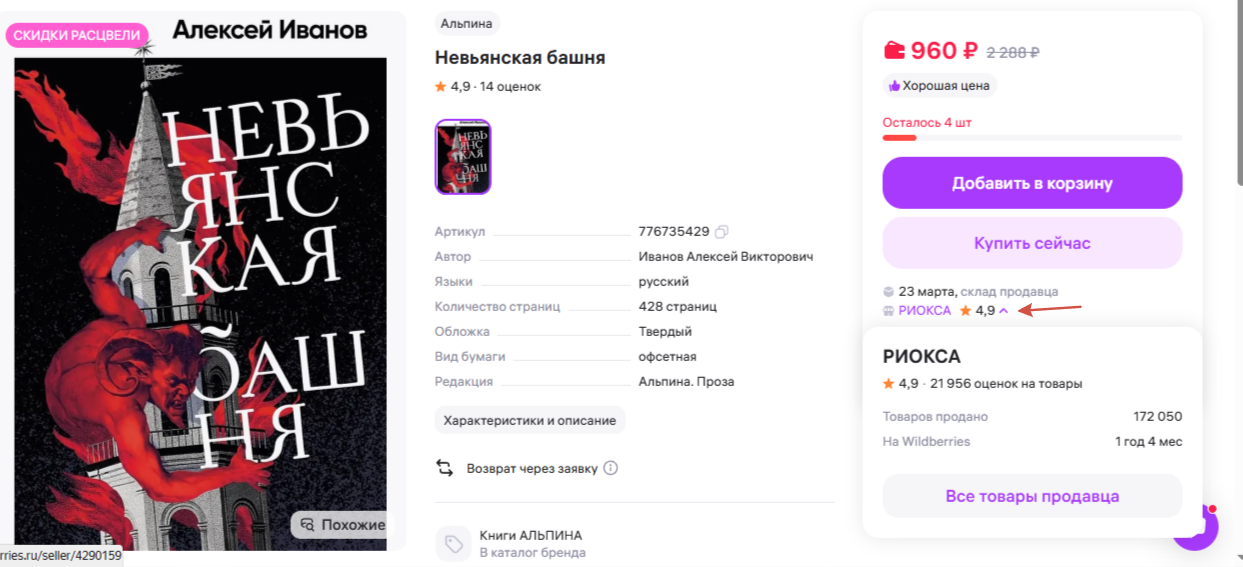 Посмотреть его можно прямо в карточке товара. Если кликнуть на рейтинг, откроется своеобразное «досье» на продавца, которое включает: