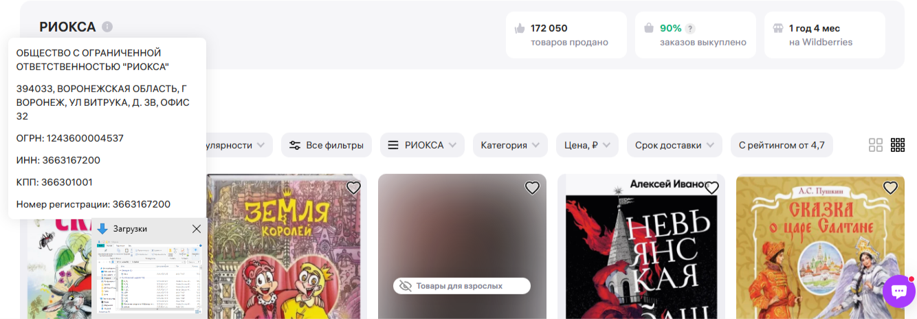 В веб-версии для того, чтобы узнать информацию о продавце, нужно навести курсор на цифру с рейтингом — сразу будет видно, сколько товаров продано и как давно магазин на ВБ.